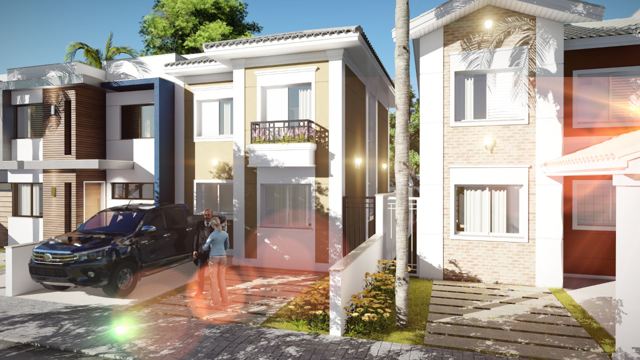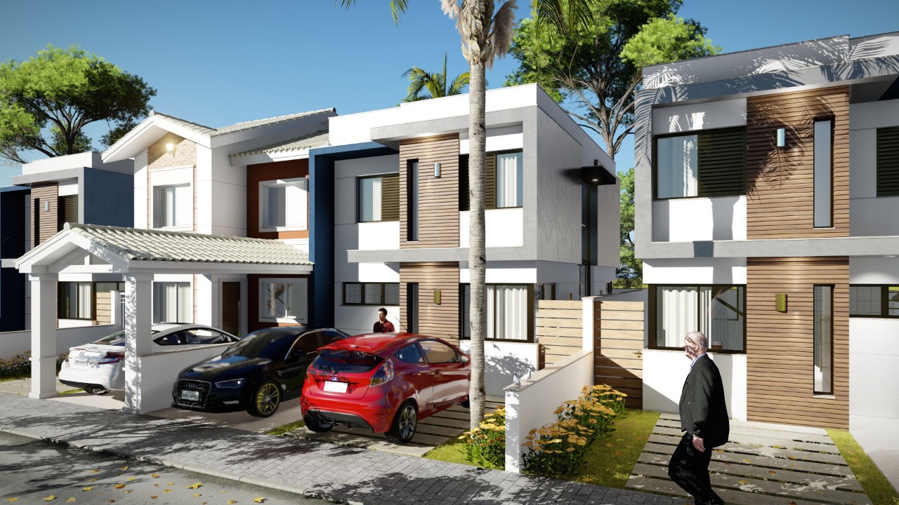 Empreendimento residencial fechado com casas de 91,32m² de área construída, área de lazer completa, piscina, churrasqueira, quadra poliesportiva e salão de festa, além de segurança e portaria 24hs, cada casa possui: